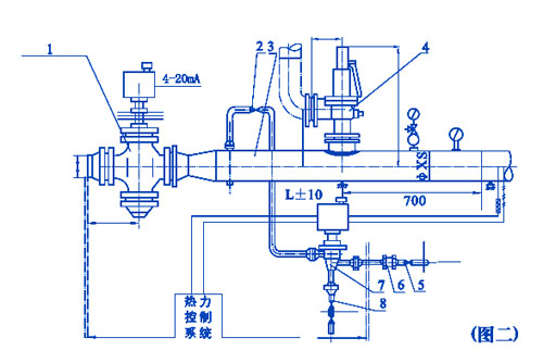 2、安全阀(件号4)下面应安置一固定支架,在减压阀前直管处和混合管道后直管道处下面应分别安置滑动支架,在装置最低处应安装疏水器,与本装置连接处应考虑补偿措施或自然补偿。以上附件和热力控制系统的现场安装接线均由用户自行解决。
